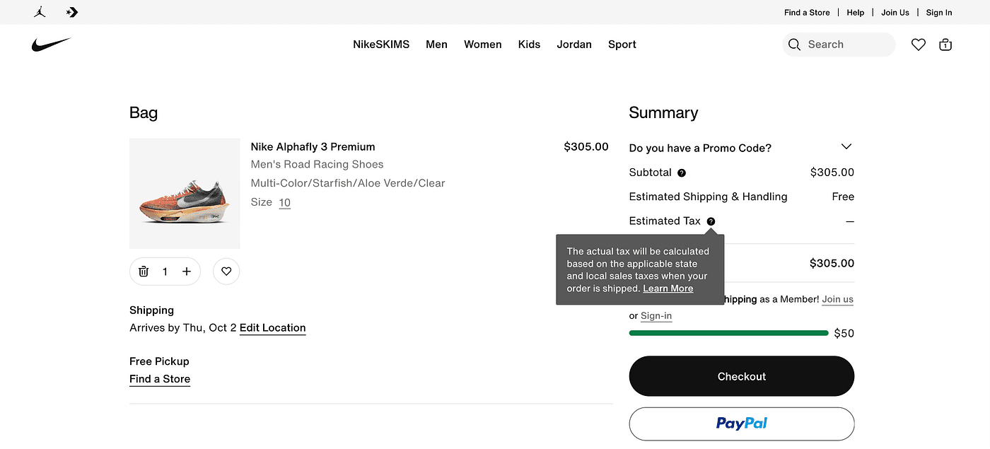 The Problem: Nike currently hides shipping costs and taxes until late in the checkout process, contributing to the large number of users who abandon due to unexpected costs.